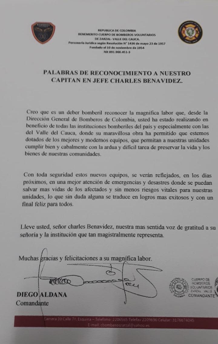el cuerpo de bomberos del Municipio de Zarzal exalta la labor que ha venido desempeñando el Capitán en Jefe Charles Benavidez. Muchas Gracias Julio 22 de 2021
